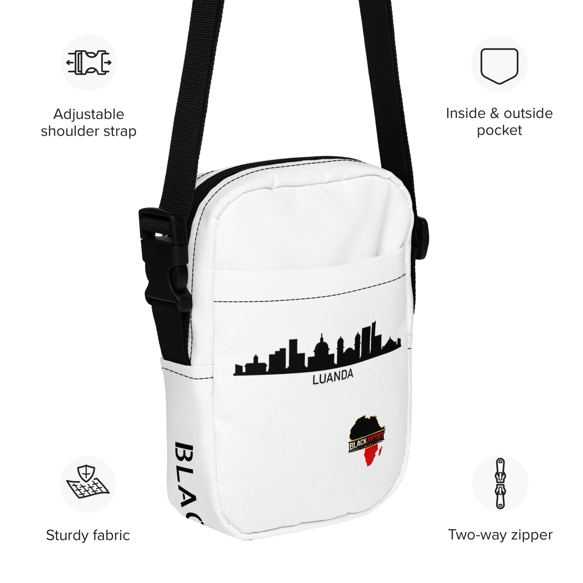 Le sac LUANDA – Nomade BlackArtist est une pièce urbaine, pratique et symbolique, pensée pour ceux qui avancent avec leur histoire sur l’épaule. Son design blanc épuré met en valeur une silhouette iconique de la ville de Luanda, capitale vibrante, symbole de renaissance, de modernité et de résistance africaine.