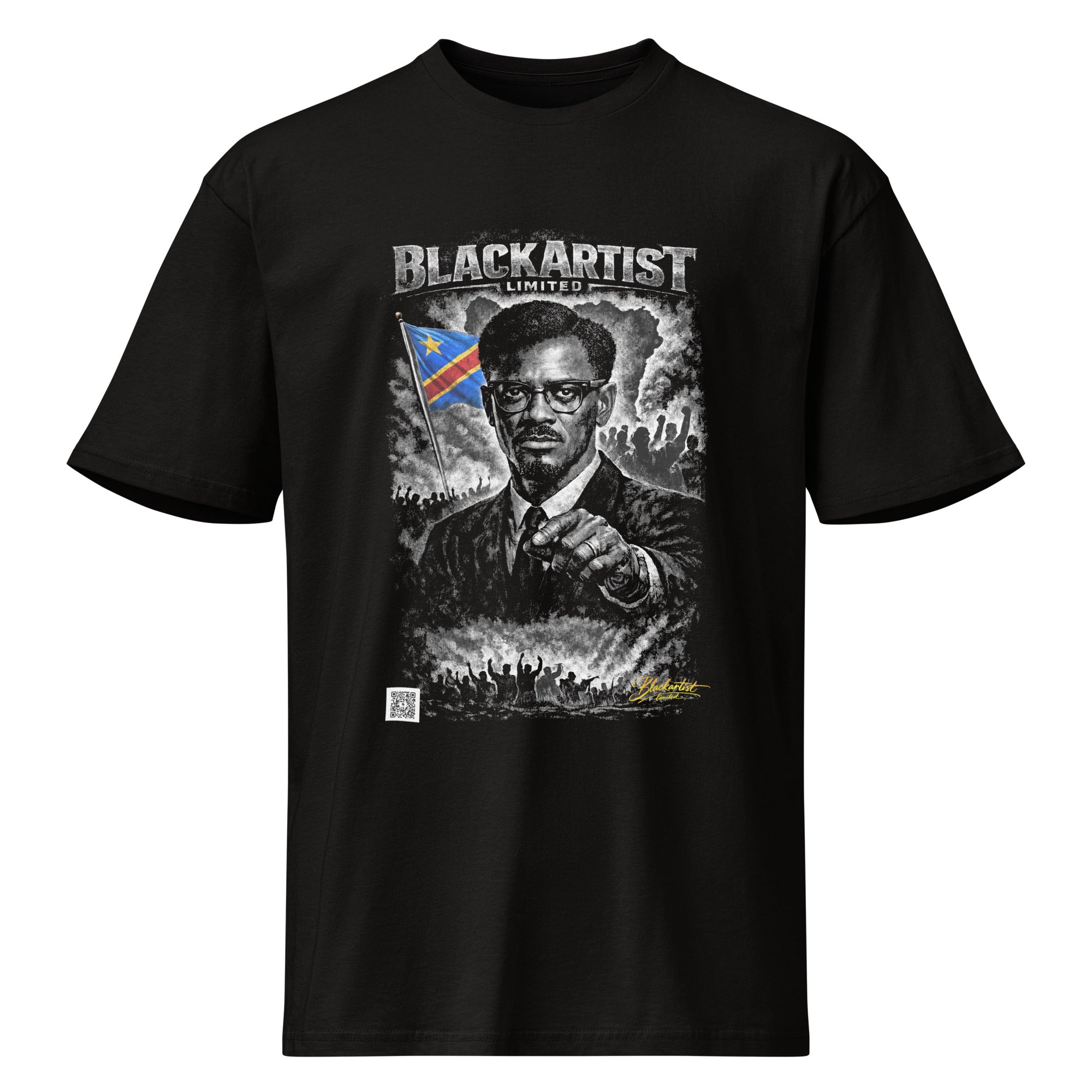 Au centre, Patrice Lumumba, droit dans les yeux, le doigt pointé vers le porteur.