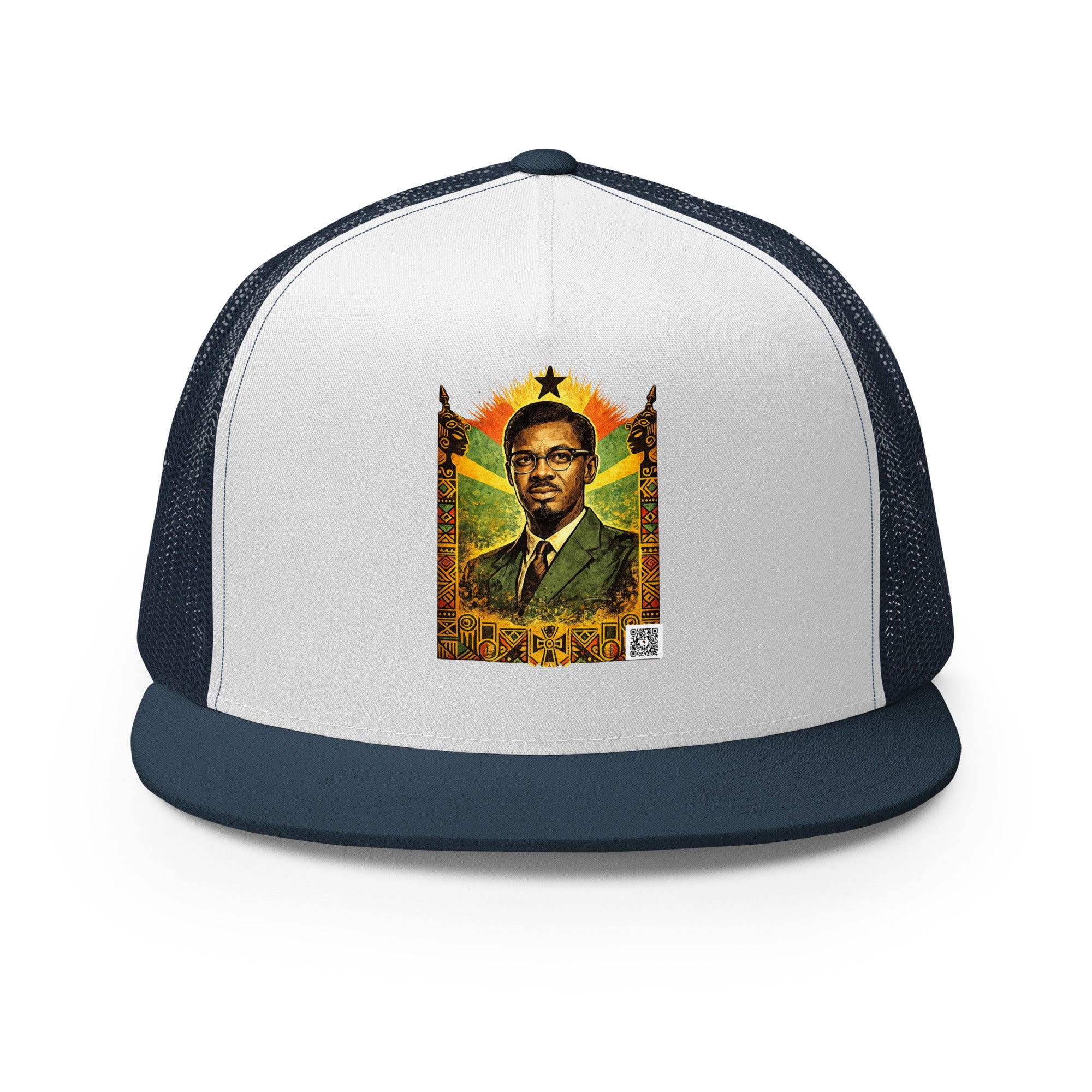 Le portrait de Patrice Lumumba, figure éternelle de la dignité africaine et de la souveraineté confisquée, est ici imprimé comme une icône historique, entouré de motifs africains sacrés et de couleurs panafricaines en fusion. Son regard traverse le temps : calme, lucide, insoumis.